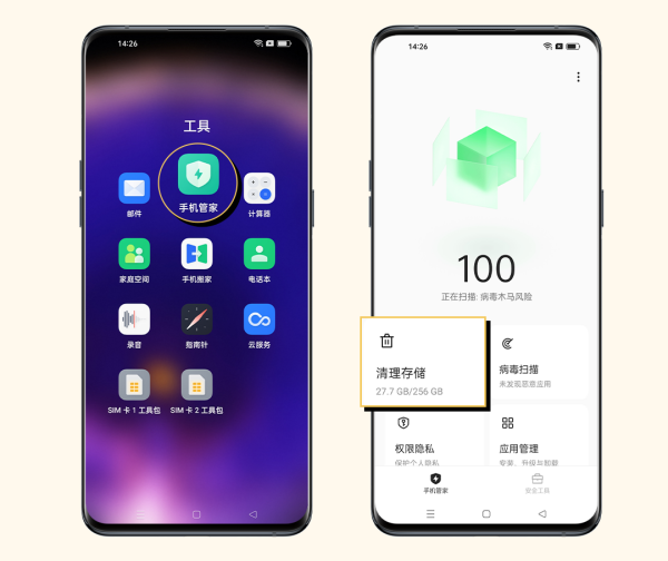 操作方法:打开「手机管家 > 清理存储」,即可一键清理;