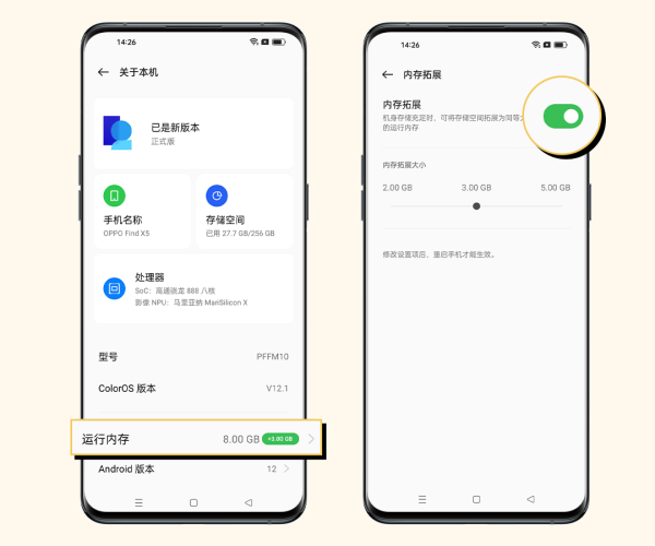 操作方法:打开「设置 > 关于手机 > 运行内存 > 内存拓展 」,按需选择拓展大小,选好后重启手机。