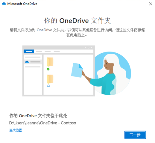 在“这是你的 OneDrive 文件夹”屏幕上,选择“下一步”以接受你的 OneDrive 文件的默认文件夹位置。 如果要更改文件夹位置,请选择“更改位置”- 这是进行此更改的最佳时机。