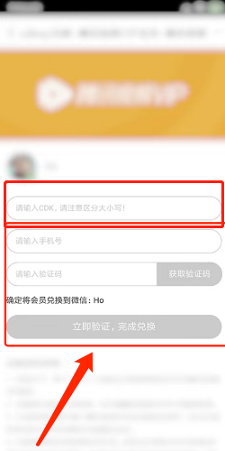 5、点击以后,我们在输入框内输入自己兑换码。然后通过手机获取验证码,提交后即可兑换会员。提交以后兑换的会员会立即到账。如果原有开通的有会员,那么会员天数会叠加。