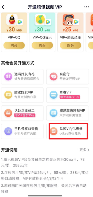 3、接下来往下滑动到“其他会员开通方式”区域可以看到“兑换VIP/优惠券”点击进入兑换页面。