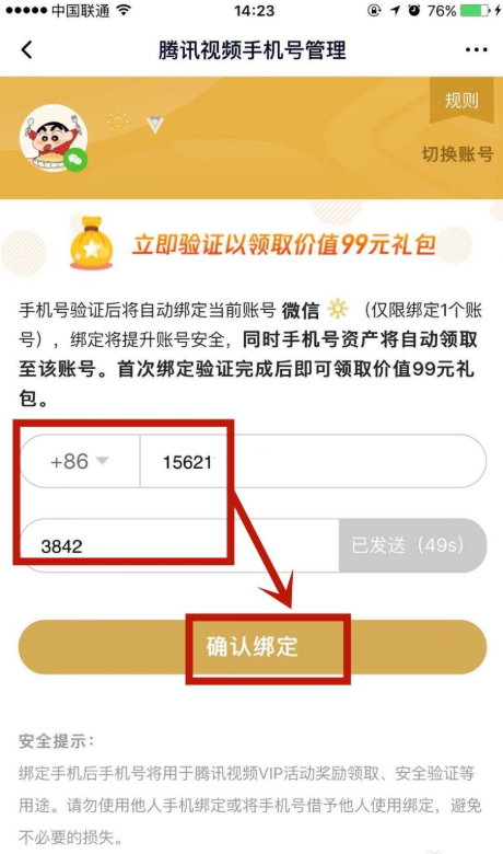 7、在腾讯视频手机号管理页面,输入手机号跟验证码再点击下方的确认绑定。