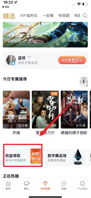 1、我们解锁自己的手机后,在手机中找到腾讯视频打开,找到下方中间VIP会员。然后再找权益领取。