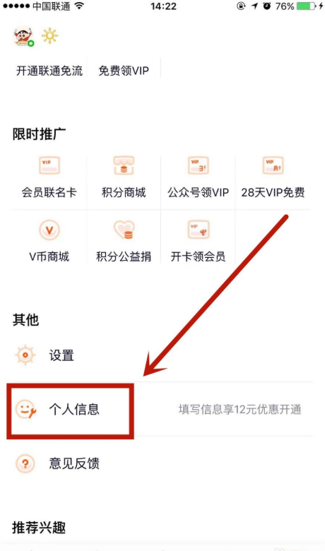 5.进入我的页面后下滑找到并点击进入个人信息。点击腾讯会员使用。