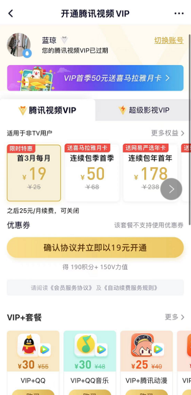 腾讯视频VIP会员月卡使用规则: 1、会员有效期:自兑换成功之日起一个月内。若用户当前腾讯视频VIP会员未结束,兑换后,会员时间将自动延续一个月; 2、同一腾讯视频VIP账号只允许本人在最多5个设备上使用,且同一时间同一账号最多可在2台设备上同时观看; 3、QQ和微信帐号开通的腾讯视频VIP会员是相互独立的(不互通),请在开通的时候注意选择登录的帐号; 4、兑换时需输入正确有效的手机号、QQ号或微信号,因输入错误导致领取失败,不予补赠。一个手机号(即权益中心登录的手机号)最多为两个QQ号进行兑换 5、权益说明: (1)内容特权:院线新片持续更新,独家王者美剧,畅享全球纪录片,热剧提前看,每月赠相关文章