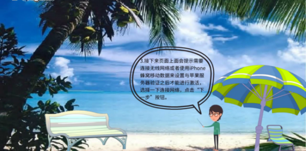 3,页面上面会提示需要连接无线网络或者使用iPhone蜂窝移动数据来设置与苹果服务器验证之后才能进行激活,选择一下连接网络, 点击“下一步”按钮。