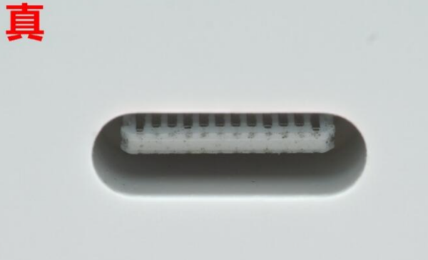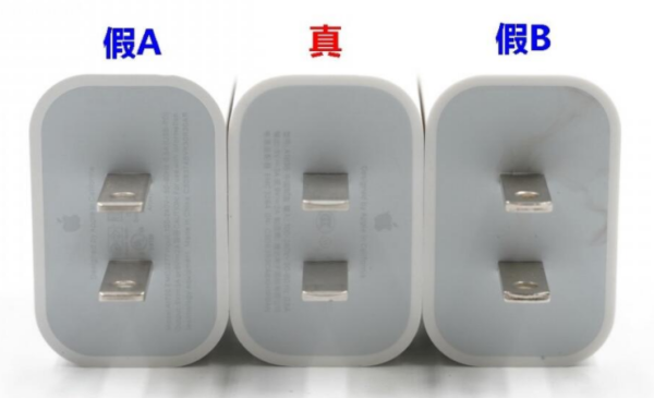 苹果的工艺设计世界第一,注重细节是其特点,电源适配器也不例外,看下图可见真货的插脚圆润光滑,而假货则坑坑洼洼,一眼就能看得出来。
