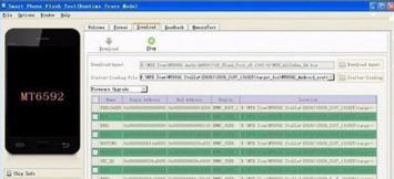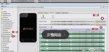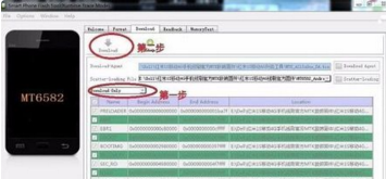 运行 升级工具 文件夹里的flash_tool刷机程序,如第一步所示,然后操作软件,点开Download-Agent再入文件夹里面Dload.bin这个文件;点开Scatter-loading导入线刷官方固件这个文件夹里面MT6592_Android_scatter.txt刷机引导文件; 操作好如下图所示: