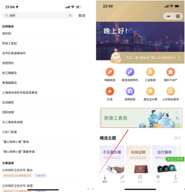 1、单位法人或授权经办人打开“随申办”APP或“随申办”微信、支付宝的小程序,搜索“场所码”或打开首页“防疫工具包”,进入后点击“场所码”。