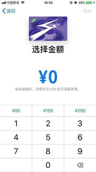 选取要充值到交通卡上的金额。如果您添加的是交通联合 (China T-Union) 交通卡或上海交通卡,则您可能会被额外收取 RMB 20 的可退服务费。