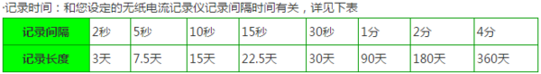 T910超薄大屏无纸记录仪记录时间的长度和记录间隔有关系,记录间隔是1S的时候,记录时长是24天; 间隔2S的记录时长48天,间隔4S的记录时长96天--------以此类推间隔240S的记录时长5825天。