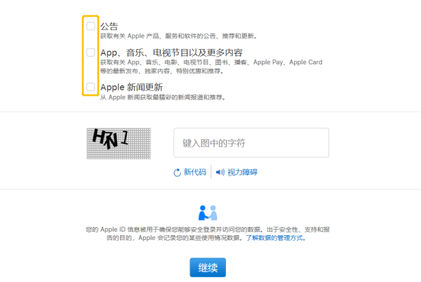 下面这三项如果你不想接受苹果的推送可以取消选中,输入字符点击继续。