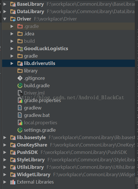 注意点:这些看上去和Driver平级的几个module,其实在真实的文件目录下是不存在的,也就是说你直接进入硬盘查看文件是没有这几个目录的,只有在AS中才能看到,这些module的真实目录就是他们自己所在的lirary项目目录,这样就保证了多个项目同步使用一个module。配置settings.gradle中module的File的路径时需要注意,里面应该填写的是module的真实目录,因为我的module根目录和项目是在同一个工作空间的,如果你的module的根目录和项目不再同级目录,则应该做出对应修改。