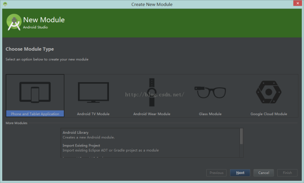 使用Android Studio创建module,New Module窗口提示选项的各个module区别: