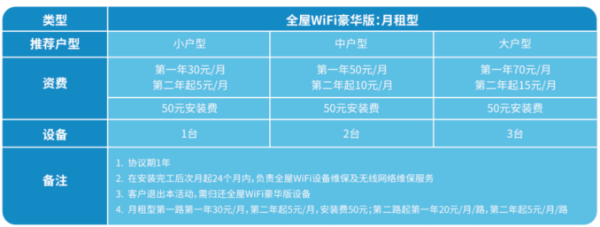 资费:首个礼包360元,第2个礼包起280元/个,免收一次性安装调测费。(每个礼包含1台全屋Wi-Fi豪华版设备)