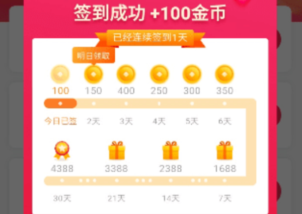 1、签到获得+100金币,每天签到都可以获得对应的金币奖励。