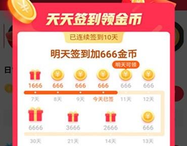 3、签到领金币。快手每天签到领金币,连续签到一周,越到后面金币越高,坚持每天签到。