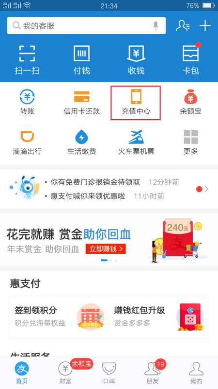 2、进入支付宝以后,选择“充值中心”选项,如图。