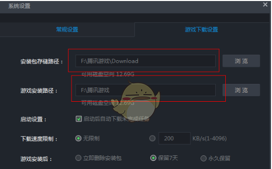 2、然后在里面我们切换到游戏下载设置页面中,然后在里面修改一下安装包存储路径或者游戏安装路径,修改完成之后再次尝试安装腾讯手游助手即可。