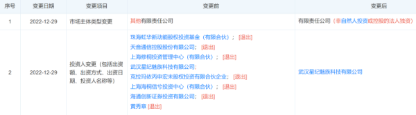 易车讯 12月30日,据“天眼查”显示,近日,珠海市魅族科技有限公司发生工商变更,原股东天音通信控股股份有限公司、珠海虹华新动能股权投资基金(有限合伙)、海通创新证券投资有限公司、黄秀章等退出,吉利控股公司武汉星纪魅族科技有限公司成为唯一股东;同时,市场主体类型由“其他有限责任公司”变更为“有限责任公司(非自然人投资或控股的法人独资)”。