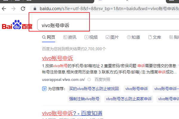 3、然后再搜索结果中点击vivo账号申诉官网。