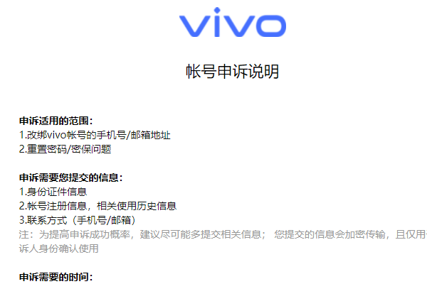 2、若不能自助找回vivo账号密码,可通过帐号申诉重置密码。请点击此链接,申诉原因选择“忘记密保问题”或“邮箱停用,改绑邮箱”,然后根据提示填写相关资料申诉帐号。