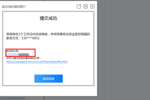 13、提交申诉,弹出“提交成功”界面,可获取申诉流水号,后续可通过申诉流水号,查询申诉进度