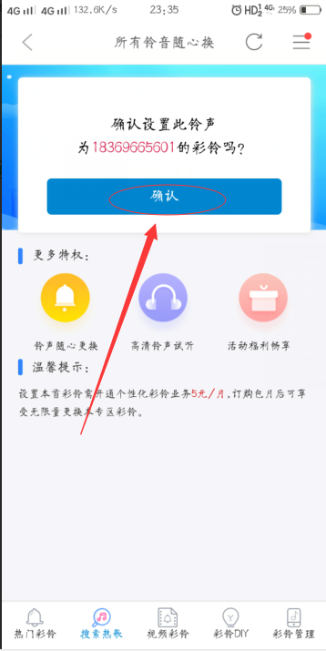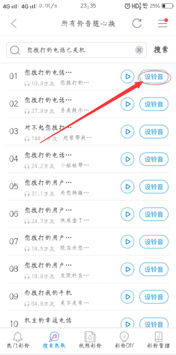 3、在搜索栏里打出“你拨打的电话已关机”,搜索并找到合适的铃声后点击进入设铃音,如下图所示: