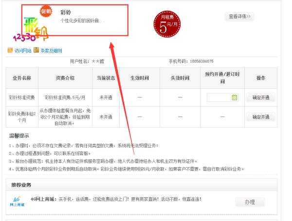 第六步:在彩铃业务后面,选择开通,然后进入设置需要的铃声即可,如下图