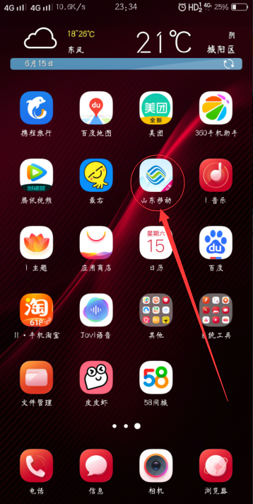 1、首先打开vivox20手机桌面,点击进入山东移动APP,如下图所示: