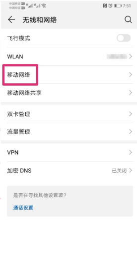 进入无线和网络界面,点击移动网络