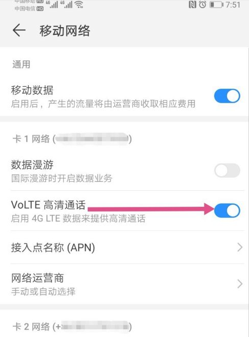 您好,手机屏幕状态栏显示HD图标,说明手机开启了VoLTE高清语音功能,不需要可以进行关闭,华为手机关闭方法如下: