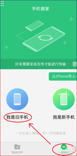 2、如图点旧手机的“一键换机”,然后选择“我是旧手机”。