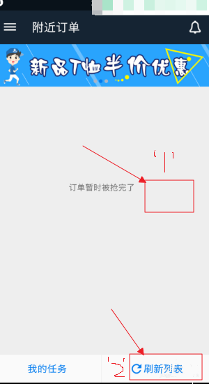 二、不可以一个手指头去抢单,要两个或者多个,而且要快,两个手指的位置大约是,一个在刷新列表,一个在接单附近(具体位置要根据自己的手机和经验确认),具体位置详见下图标注的“1”、“2”所在位置。