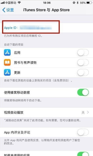 3、点击进入itunes store与App Store选项以1653后,点击AppleID。