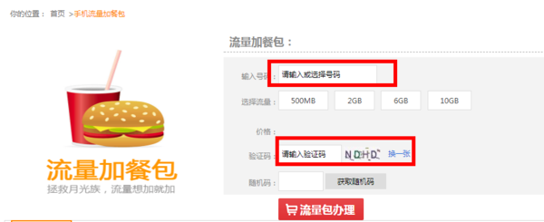 2、然后用户输入需要办理的手机号 选择需要办理的流量加餐包的档次,然后在输入接收的验证码即可办理流量加餐包业务了