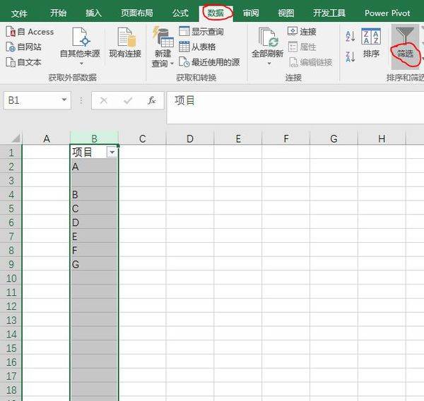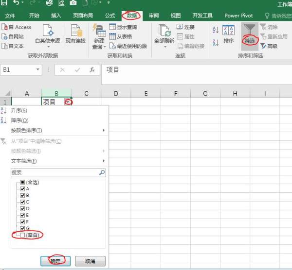 2、在“筛选”中,取消勾选“空白”,确定后,即可实现将B列空白单元格所在行隐藏起来的效果。