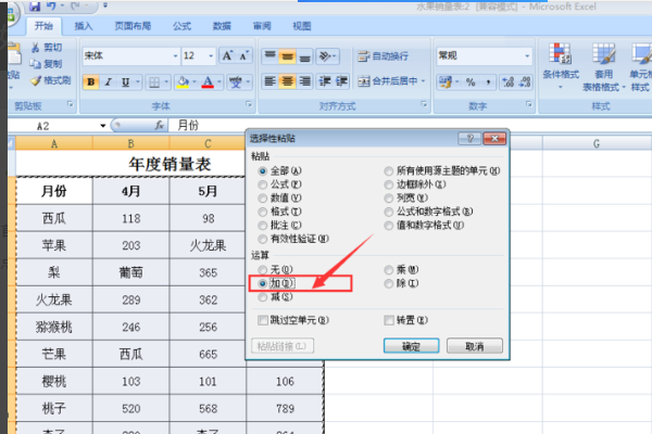 4、在跳出来的选择性粘贴窗口中选择“加”,点击确定。
