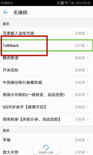 使用华为手机时,有时点击手机屏幕上的选项会出现一个绿色框,这是因为启动了TalkBack功能,这里分享下关闭这个绿色方框的方法。