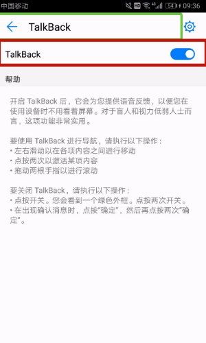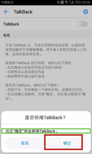 如果开启TalkBack模式,触屏方式会产生变化,触屏时屏幕会显示绿框,可按以下方法关闭: