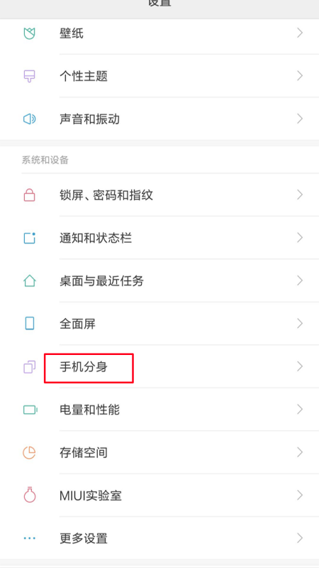 2、继续在设置页面找到手机分身这一项。