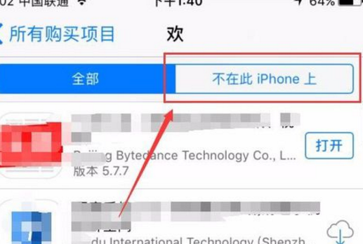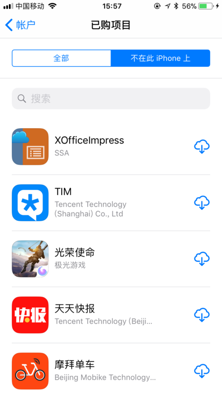 5、点击进去之后就会看到所有我们已经安装或者安装过的软件;点击“不在此iPhone上”,然后我们就会看到那些已经删除过的软件,需要什么直接点击云下载图标进行下载即可。