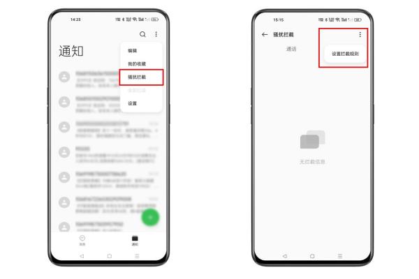 (1)ColorOS 11及以上系统机型:进入「信息 > 右上角“:”骚扰拦截 > 右上角“:”拦截规则」,进行设置。