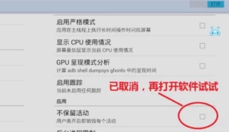 4、找到“不保留活动”的选项后看看是否打“√”了 ,若发现打勾,将其取消有可能这个原因,导致软件不能打。