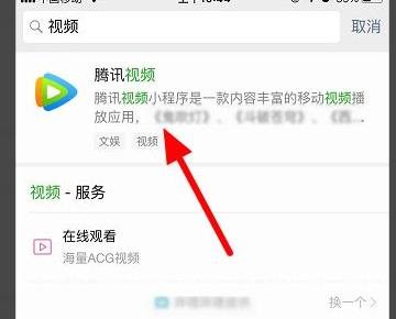 2、然后在小程序页面中,搜索【视频】,进入【腾讯视频】。