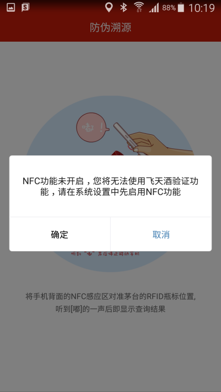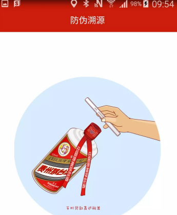 2、直接将手机正背后的NFC感应区对准茅台的RFID瓶标位置,此时会自动跳出“国酒茅台防伪溯源系统”。