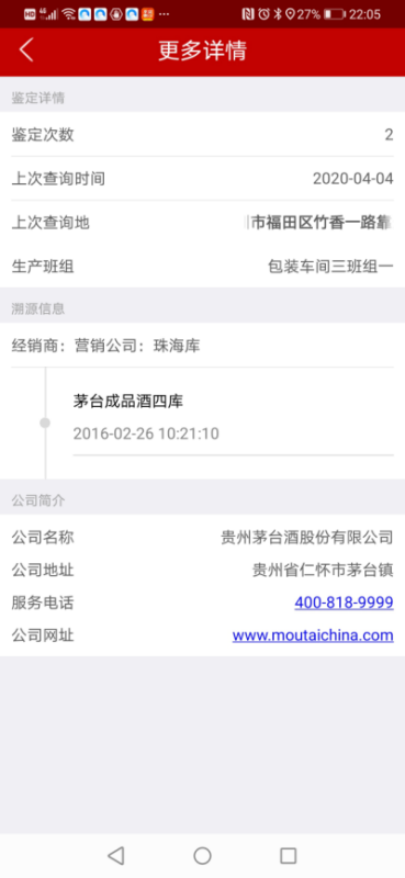 5、点击“更多详情”按钮,即可看到关于这瓶酒的一系列资料:包括鉴定的时间、地点、是第几次鉴定、哪个包装车间、经销商是谁等等。