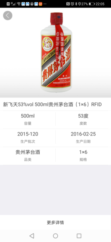 5、将手机正背后的NFC感应区对准茅台的RFID瓶标位置,“嘀”的一声后,停留片刻,如果查询成功则显示如下图类似页面则为正品;