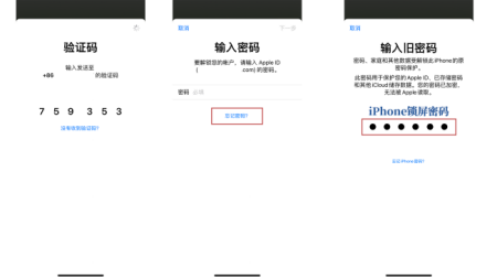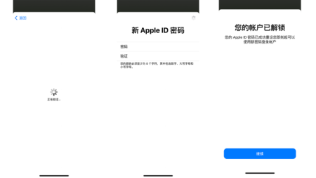 步骤3:当系统验证成功后,将会提示重新设置Apple ID密码,注意此密码不要在一年内使用过,否则无法使用。新密码设置成功后,已登录的Apple ID密码将自动更新为新设的密码。