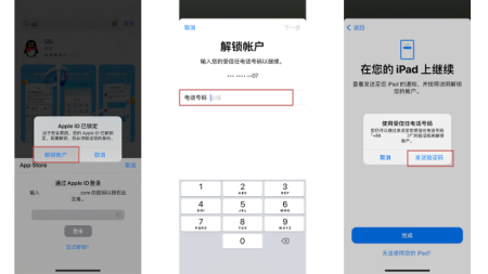 步骤1:在设备锁定页面点击【解锁账户】,如果已绑定电话或邮箱,那么可通过这种方式进行验证。填入手机号,如果此Apple ID账号登录过其它设备,还可在其它设备端进行验证解锁。如果无法使用其它设备,那么可以通过接收验证码的形式,通过短信或邮箱的形式进行验证。